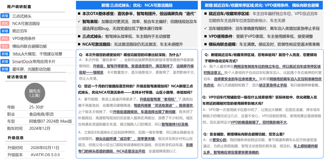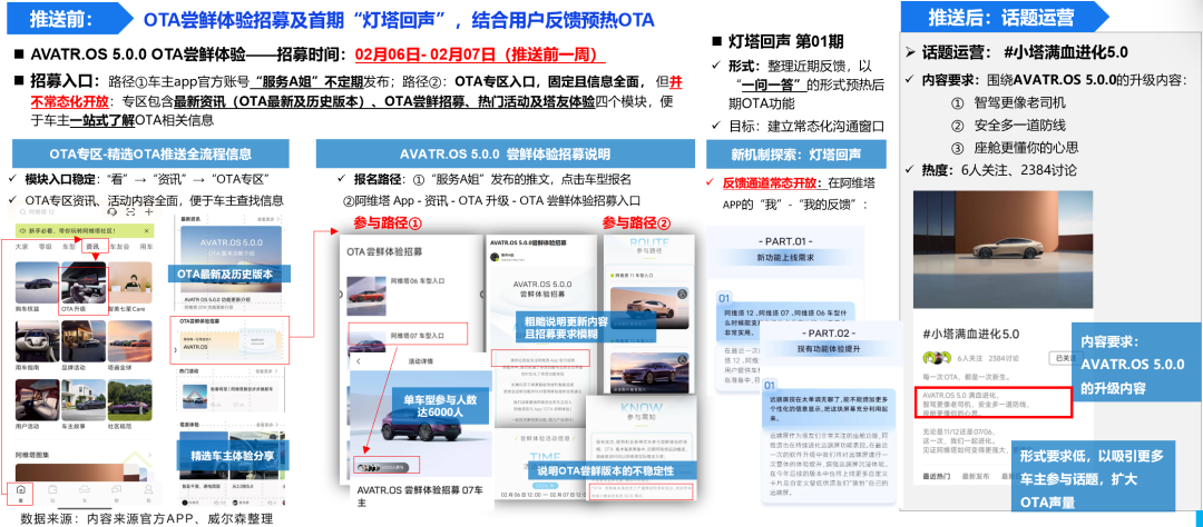 海量资讯、精准解读,尽在新浪财经APP 本月,阿维塔探索发布新机制“灯塔回声 第01期”整合用户高频需求和建议,对已进入开发阶段(即将OTA)的功能,引导车主常态化反馈,结合非常态化但深度体验的“OTA尝鲜体验”反馈,吸引车主关注,预热本次OTA。