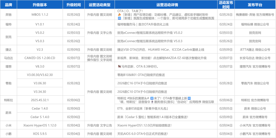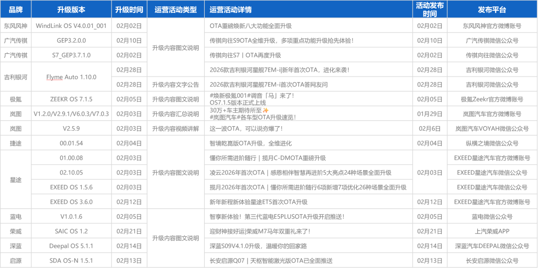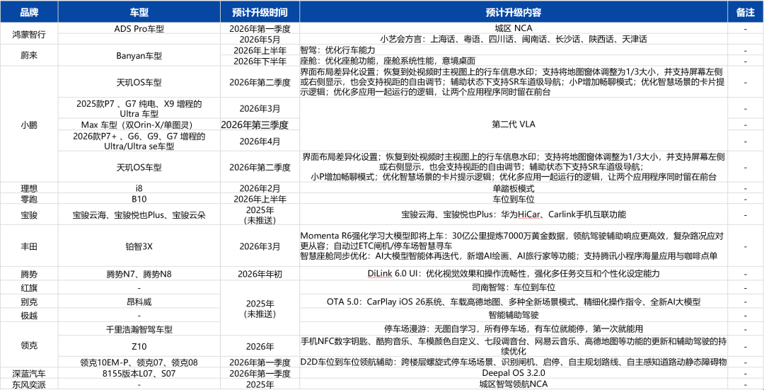 2026年2月,行业共计更新1229项功能(上月2003项),升级功能数量略有回落,20+品牌在春节前更新了OTA,升级聚焦于春节返乡场景。智驾新增三点式掉头、轮毂辅助等功能,优化乡道、窄路通行能力;座舱侧深化AI大模型赋能,覆盖更多座舱场景,升级“主动服务”,语音交互更自然贴心,对话更拟人。