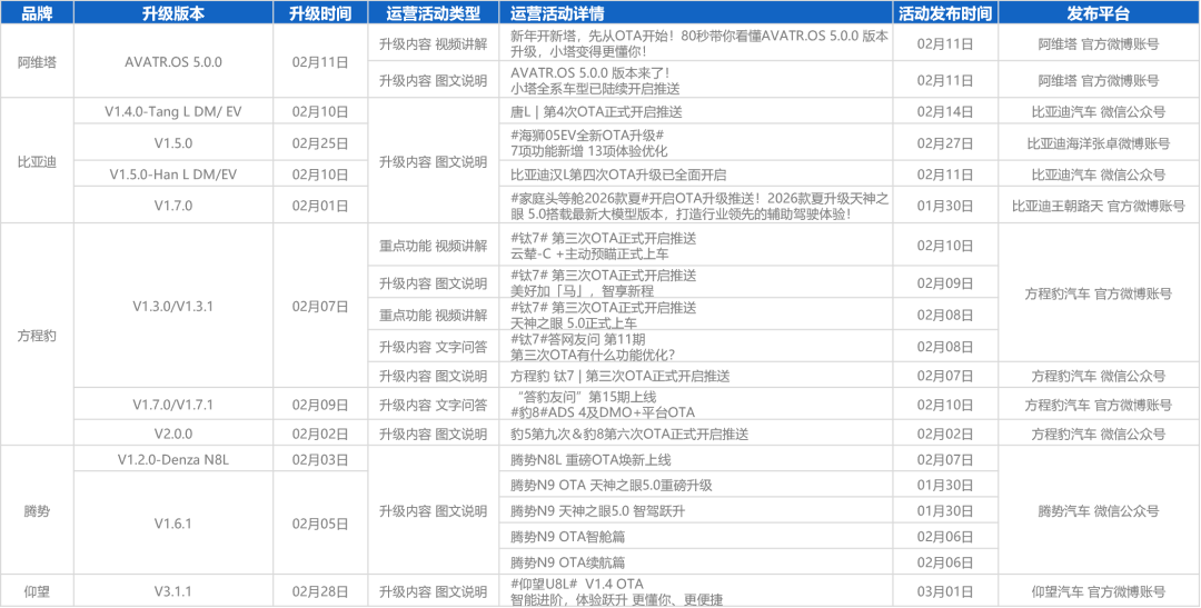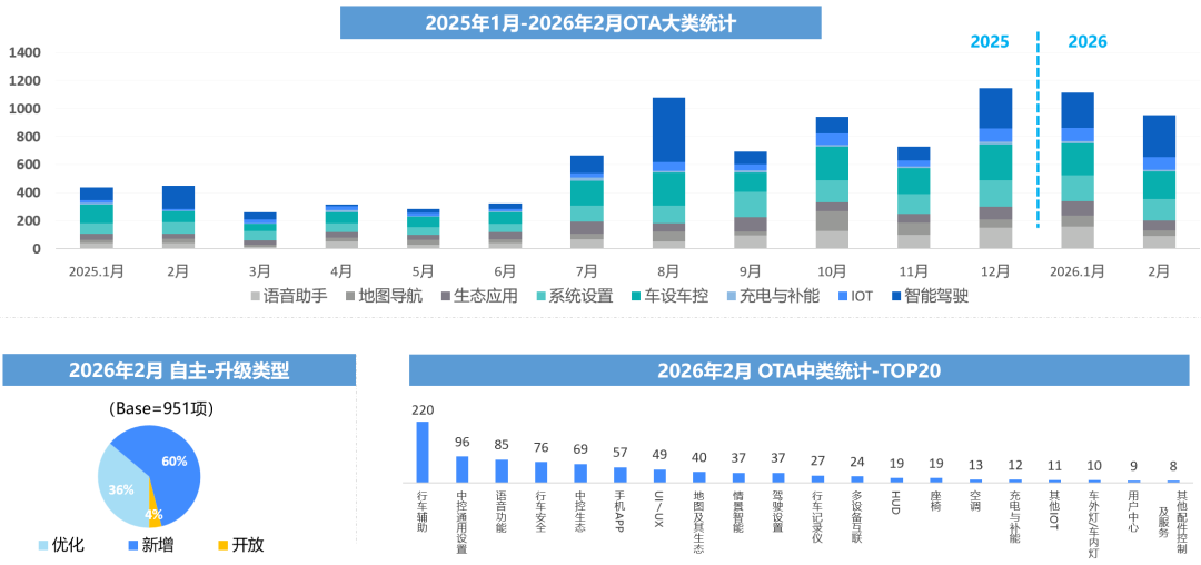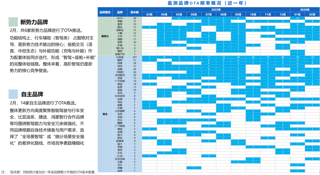 2026年2月,自主品牌共计更新951项功能(上月1114项),较上月有所下降,整体进入阶段性调整期。在功能方向上,智能驾驶模块成为竞争核心:比亚迪系品牌全面推进天神之眼5.0,优化行泊能力;捷途开放车位到车位2.0;鸿蒙智行赋能合作品牌新增eAES防夹心和三点式掉头功能,各厂商均在强化安全冗余与智驾体验,智驾相关更新在大类统计中占比突出。