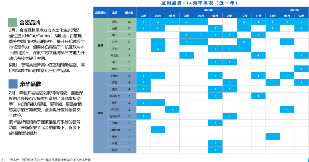 2026年2月,合资&豪华品牌共计更新35项功能(上月50项),功能数量略有回落。升级类型以优化为主,打磨基础体验的同时,在有限范围内补充新功能:捷达新增HiCar/Carlink、马自达上线Bilibili、百度地图等。整体而言,各品牌更新方向并非追求技术领先,而是聚焦补齐智驾短板、适配本土生态、优化基础体验。